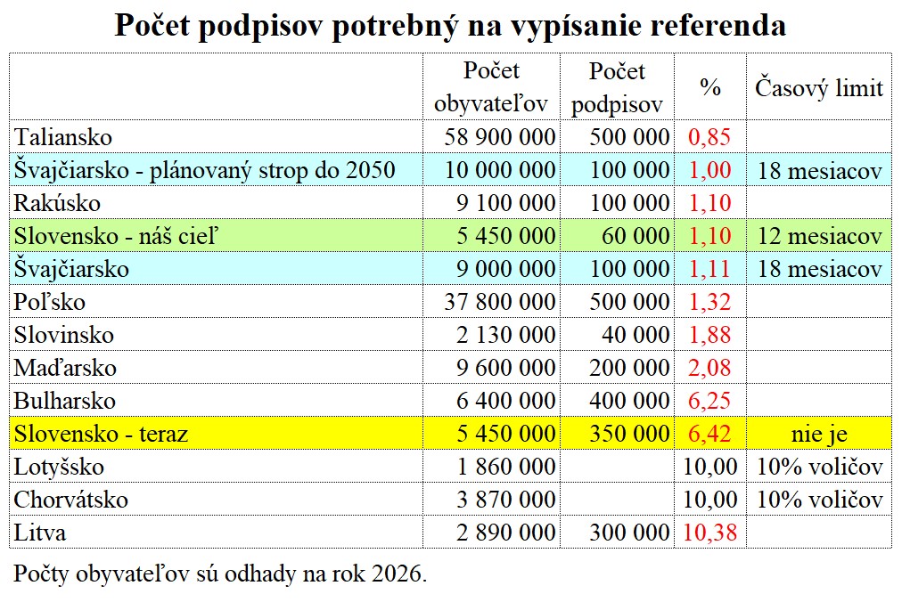 • Na vypísanie federálneho občianskeho referenda vo Švajčiarsku treba vyzbierať 100 000 platných podpisov v priebehu 18-tich mesiacov. Švajčiarov je 9,0 miliónov. V prepočte na 5,4 milióna slovenských občanov to je 60 000 podpisov.